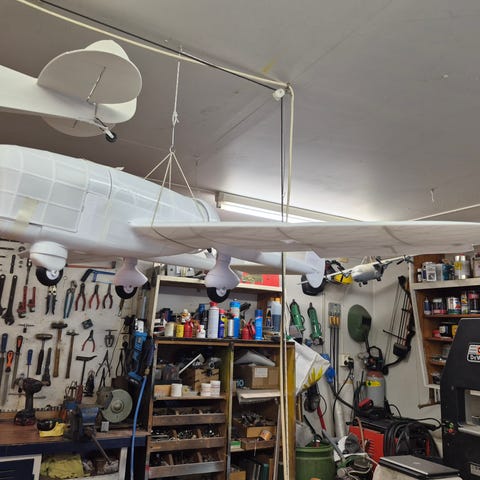 B-17 Flying Fortress RC bombefly. Dette er modell av det amerikanske legendariske " Memphis Belle" som ble brukt under andre verdenskrig. Flyet er et imponerende skue både i luften og utstilt på bakken. De 4 propellene har flott lyd når den seiler forbi på himmelen. Vingespennet er på 185 cm og lengde på skroget 134 cm. Den har blitt oppgradert med 4 stk kraftigere børsteløse outrunner motorer, der 2 av dem er av merke E-flite og 2 av dem er Turnigy. Har valgt å bruke 2 bladers propeller på disse. Det er installert 4 stk 60 amp regulatorer og det står en 7 kanals Spektrum mottaker i flyet nå ( tar ut mottaker før salg ) Denne warbirden er laget av EPO og har elektriske retracts i stål samt flaps og realistiske led-lys. Trengs minimum 6 kanaler på radiostyring for å bruke alle funksjoner. Vekt fight ready er på 3,5 til 4 kg. ( litt avhengig av tyngde på batteripakkene ) Det følger med 2 stk 4 cellers lipo batterier som er i ok stand. De 4 originale 3 blads propellene følger også med.