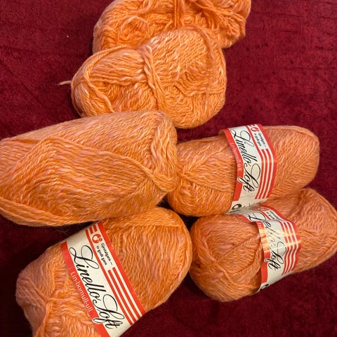 5 bunter fint rosa bomullsgarn. En av buntene er åpnet.