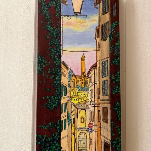 Nydelig lite eldre italiensk oljemaleri på lerret med gullramme i tre selges for kr. 550,-. Rammemål 34x28 cm. Kan sende dersom kjøper betaler frakt (69,- med sporbar pakke).