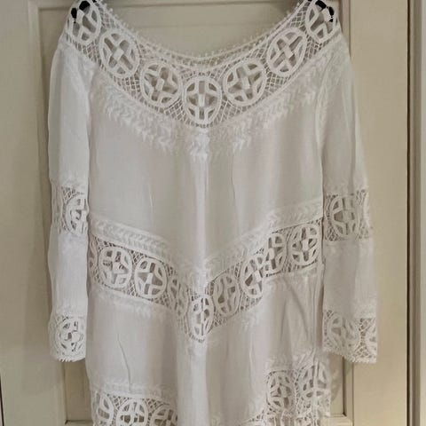 Sommerkjole i hvit bomull for dame i one size. Kjolen har v-utringning med knappelukking foran og broderte blondedetaljer på overdelen. Nederdelen har hullbroderier som gir et lett og luftig uttrykk. Ermene er trekvart lange med lett vidde. Passer godt som sommerkjole alene eller som strandkjole over badetøy. Ny pris 799,-