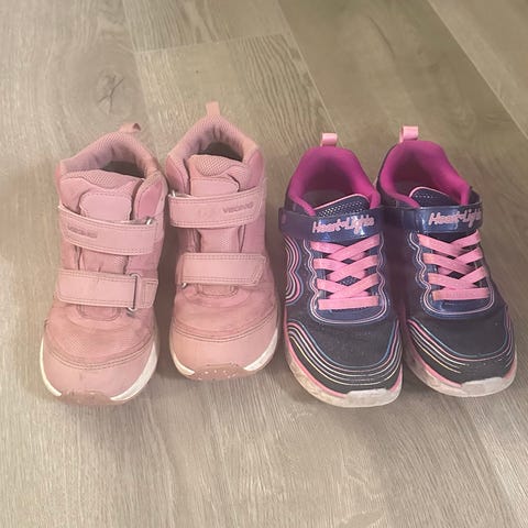 Puma joggesko til jente i størrelse 27. Skoene er i rosa nyanser med hvit såle og lukkes med borrelås og elastiske lisser. Egnet som hverdagssko og til lek både inne og ute for barn i aktuell skostørrelse. Prisen er for begge to joggesko
