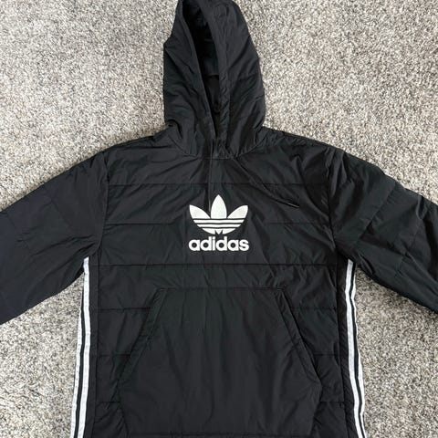 Adidas jakke for dame i størrelse 34 men er type oversize. Jakken er svart med de karakteristiske stripene langs ermene og har hette.