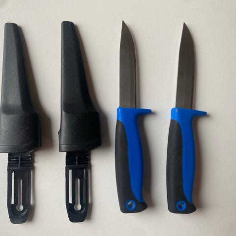 Tre Eka kniver med oransje håndtak. Flå, vomming og utbeining. Slaktet to rådyr med de, og de fungerer som bare det. Jeg fikk et skikkelig fancy knivsett til jul, så jeg bør, for husfredens skyld, bruke de. Slipt med Tormek og avsluttet med japansk slipestein, så disse kan man barbere seg med. Kan sendes.
