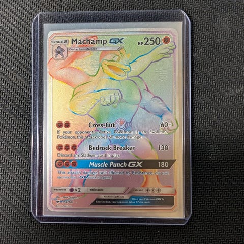Pokémon Mewtwo GX samlekort. Kortet viser Mewtwo GX med angrepene Full Burst, Super Absorption og Psystrike GX. Standard Pokémon-bakside. Egnet for samling eller bruk i Pokémon Trading Card Game. Kortet har en liten skramme på baksiden.