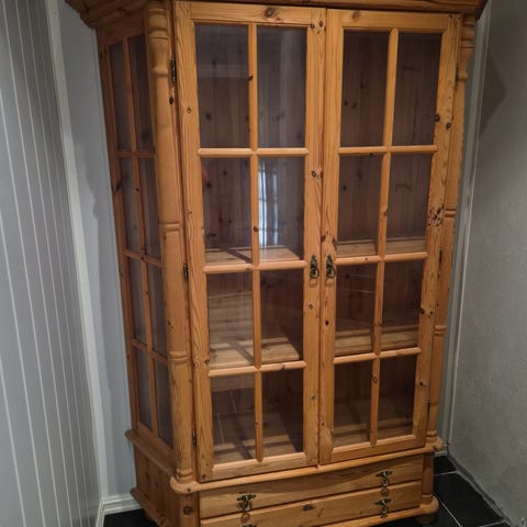 Framskap/vitrineskap i heltre furu. Solid, ingen skader.