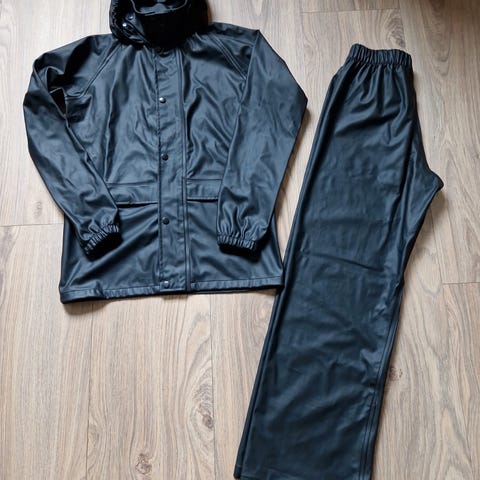 Stormberg regnsett for gutt i størrelse 146-152 i svart farge bukse ,mørke blå jakke ,Sett med jakke og bukse. Jakken har hette og glidelås foran, samt refleksdetalj på ermet. Innsiden har glatt fôr. Buksen har strikk i livet for bedre passform. Materialet inneholder elastan for økt bevegelighet og komfort. Egnet som yttertøy i regnvær for barn i aktuell størrelsesgruppe.