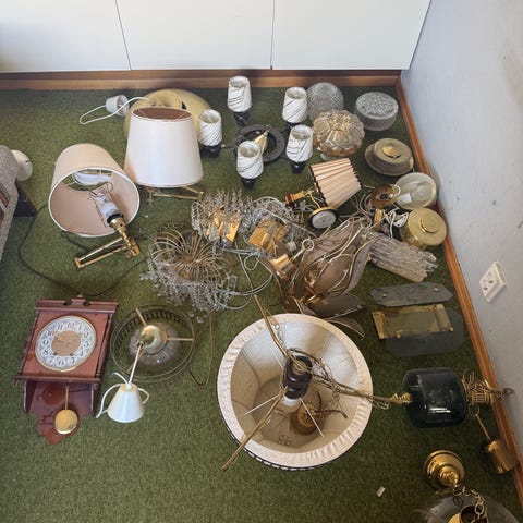 Ett par med vegglamper fra 60/70-tallet . 15 cm lange kupler, 11 cm diameter. Som bildet viser så virker begge to, og har tre meter kabel med bryter på hver. De kan også brukes uten tekstiltrekk, under er det hvit plast.
