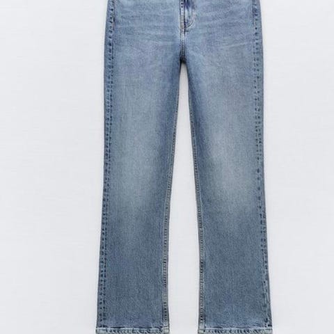 Zara jeans for dame i blå denim. Buksen er i størrelse EUR 32. Klassisk 5-lommers modell med glidelås og knapp i front. Produsert i denimstoff med tydelig vask og rette ben. Passer til hverdagsbruk og kan kombineres med ulike topper og jakker. Ingen flekker eller bruksmerker.