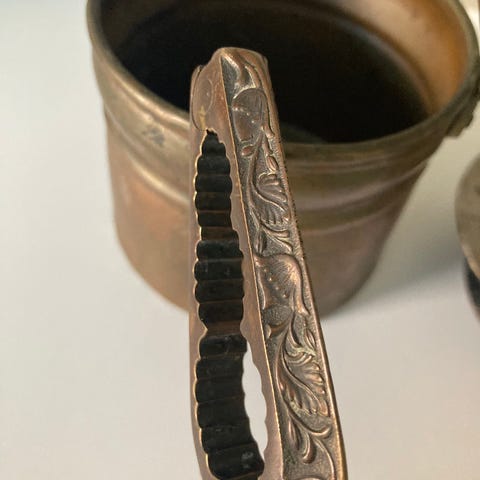 Tesil med holder i metall, antikk.