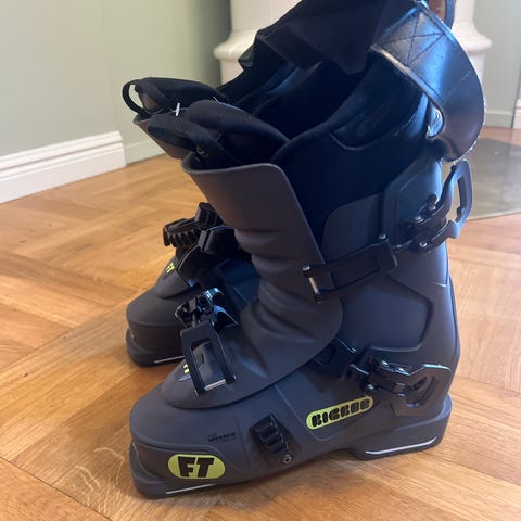 Støvlene har fire spenner og powerstrap øverst for god justering rundt leggen. Modellen har gåfunksjon (Hike) og er merket med flex 90. Innerstøvlene er uttakbare og polstrede, med oransje fôr.