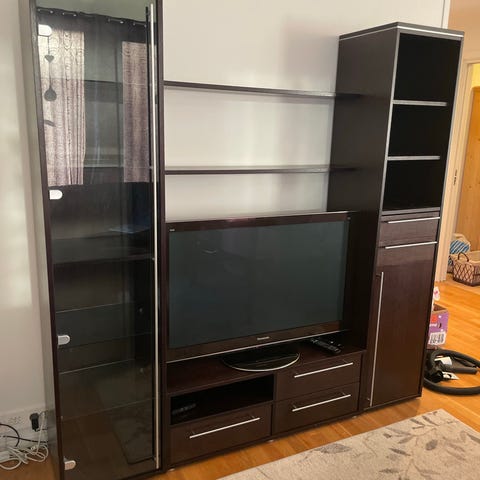 Vitrineskap har belysning og glasshyller, se illustrasjon fra Bestå planleggeren.