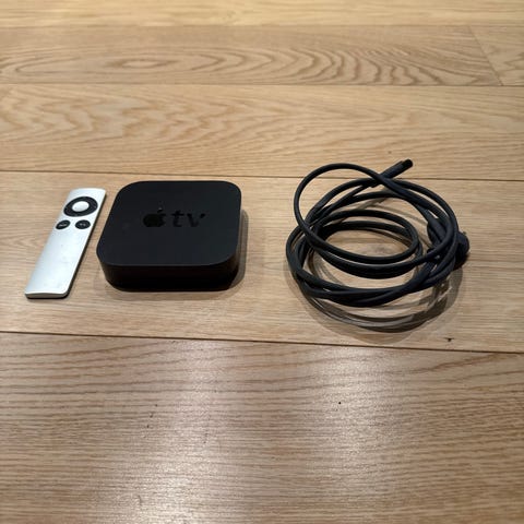 Apple TV med fjernkontroll (A1469) 3. generasjon med strømkabel og fjernkontroll.