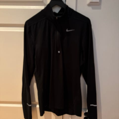 Nike Dri-Fit løpegenser for herre i størrelse XL. Genseren er svart og laget i teknisk Dri-Fit-materiale som transporterer fuktighet bort fra kroppen. Langermet modell med glidelås i halsen og hette. Egnet til løping og annen trening utendørs eller innendørs.