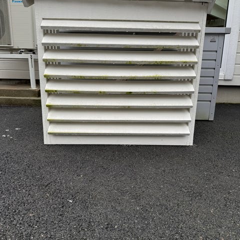 Varmepumpehus i tre, laget av impregnert treverk.
