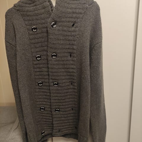 Kabelstrikket cardigan for menn fra Mulberry, laget av merinoull. Farge: mørk grå. Designet inkluderer unike detaljer som lærknapper med spenne. Et unikt plagg, produsert i Italia. Størrelse: XL.