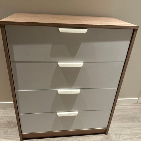 Pent brukt hvit kommode uten skrammer. Noen år gammel, men like fin. Skuffene går lett. Vet ikke hvor den er kjøpt, men virker solid. Må hentes.