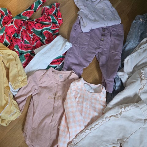 En pakke med sommerklær til jenter 6-12 måneder. Shorts, t-skjorter og sett, badedrakt , alt i god stand. Pris for alt. H&M, Cubus, Lindex, babyklær for jente i størrelse 74-80, 6-12 måneder. Pakken inneholder flere plagg i ulike flerfargede mønstre og nyanser, blant annet kortermede overdeler, shortser og badetøy. Klærne passer til baby i størrelse 74 og er egnet til bruk både inne og ute i varmere sesong, samt til bading. Materiale er typisk myke tekstiler for babyklær, som bomullsblandinger og elastiske stoff i badetøyet.