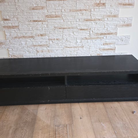 Høyglans, svart tvbenk. Godt brukt, har noen riper og merker oppå, mangler den øverste «døren» i midten.