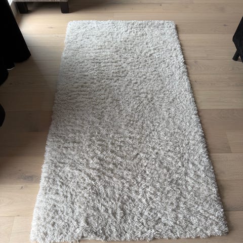 Rusta Elin teppe i størrelse 160x230 cm. Teppet er hvitt og har en myk, lang lugg. Oversiden er laget av 100 % polyester, med bakside i jute. Passer som stue- eller sofateppe, og kan også brukes i andre oppholdsrom der man ønsker et mykt og lunt gulvteppe. Teppeetiketten viser vedlikeholdsinformasjon og anbefaling om støvsuging og håndtering ved flekker.