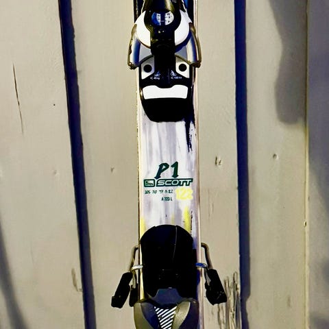Alpinski med bindinger. Fungerer fortsatt, men er noe slitt under.