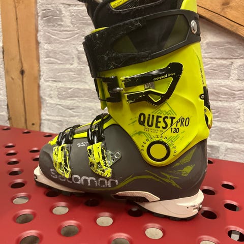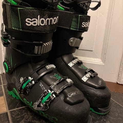 Salomon Quest Pro 110 alpinstøvler i grønn og sort med gule detaljer. Modellen har tre justerbare spenner og kraftig powerstrap øverst for god tilpasning rundt leggen. Støvlene har gåfunksjon bak for enklere forflytning uten ski. Passer til alpinbruk og frikjøring der det er behov for støtterike støvler med presis passform.