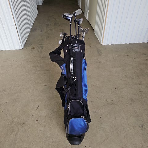 På kjøpet får du med golfbag, litt spilleballe, pegs og regnhette.