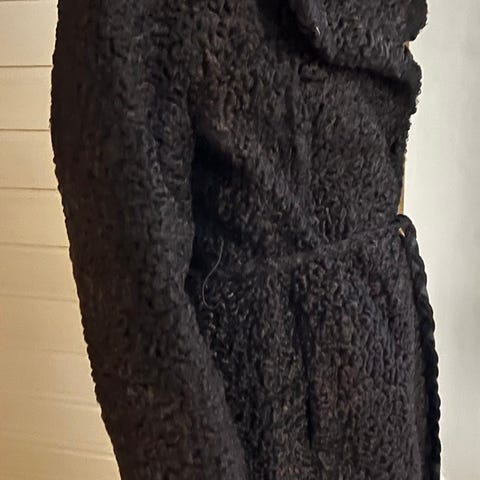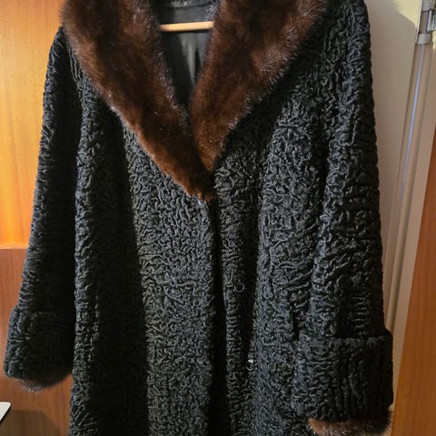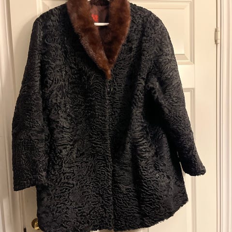 Vintage pelskåpe persianer med brun krage. Laget av E Skar &Sønni Drammen. Finner ikke str på den. M-L. Fra en av bestemødrene.
