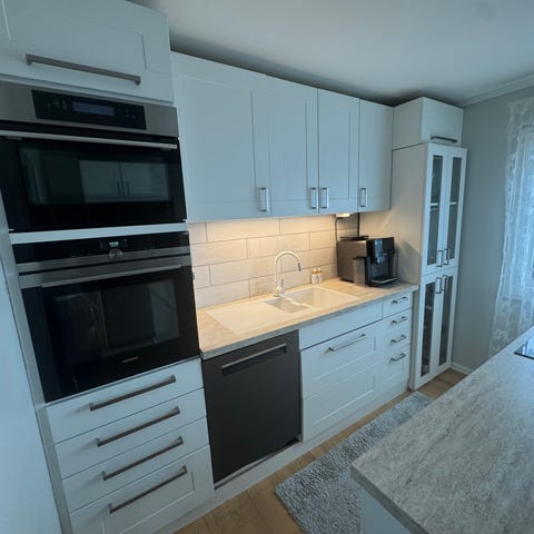 Dette har vært et hyggelig kjøkken for vår familie i mange år. Nå er det på tide å pusse opp og vi selger derfor kjøkkeninnredning fra Vårt kjøkken fra 2003. Følgende følger med: Steinplate (210x60cm). Benkeplate i tre med integrert kjøkkenmaskin (Bosch, mangler del til bakebolle). Kjøleskap/frys (side-by-side General Electic). Kaffesmaskin fra Miele (innbyggings-kaffemaskin CVA 620, ikke brukt på mange år), vifte (Siemens) over koketopp (80cmx51,5 cm, koketopp har knast) . Oppvaskmaskin og stekeovnen følger ikke med. Hyller på vegg ved vindu følger ikke med. Andre ting som kan være synlig på bildet, men som ikke er en del av innredning følger ikke med.