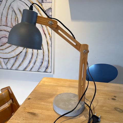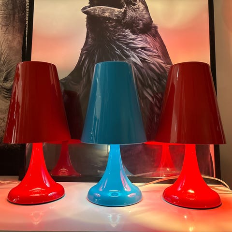 Plastmateriale, blå, bordlampe, leselys, vintage, dekor, interiør, lys.