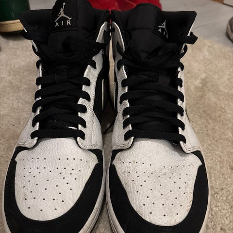 Jordan sneakers joggesko i størrelse 38. Modellen er en høy variant med snøring og gummisåle. Skoene har overdel i tekstil og syntetisk materiale i hvit og svart med rød yttersåle. Passer til hverdagsbruk og fritid.