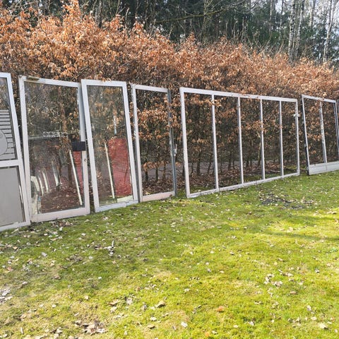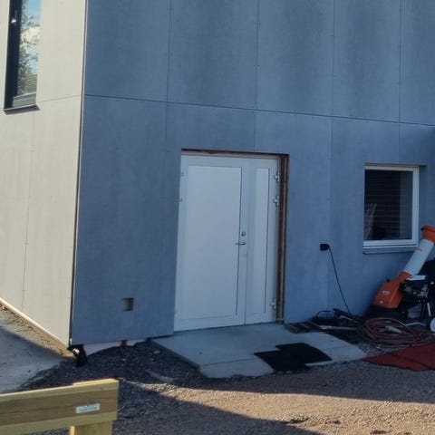 Aluminiumsdør 1100 x 2300. Venstrehengslet. Tre-lagsglass. Bøylehåndtak. Glass i øverste del. Mener det er RAL 7024. Trenger en vask.