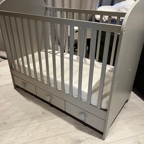 IKEA gonatt sprinkelseng med skuffer i grå utførelse. Sengen har klassiske sprosser på langsidene og avrundede gavler. Under sengen er det tre skuffer som gir ekstra oppbevaringsplass til for eksempel sengetøy eller babytøy. Sengen er laget i trebasert materiale med malt overflate. Er mulig å fjerne ein av sidene. Alt er demontert.