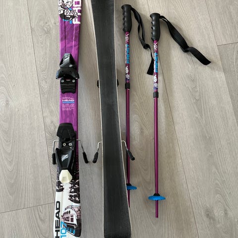 Roxy alpinski med bindinger i rosa mønster. Skiene har integrerte bindinger som er montert på skiene. Med følger et par teleskopstaver i metall med justerbar lengde og håndstropper. Egnet til vanlig alpinkjøring. Passer for den som ønsker et komplett sett med ski og staver i samme stil.