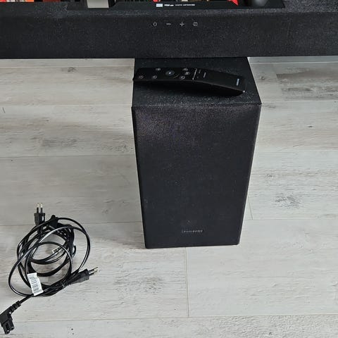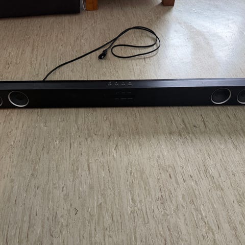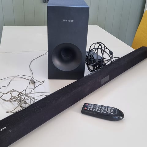 LG lydplanke med subwoofer i sølvfarge. Lydplanken har flere tilkoblingsmuligheter, blant annet HDMI og optisk inngang (basert på synlige porter på bildene). Medfølgende subwoofer er trådbundet til lydplanken. Egnet til bruk sammen med TV eller annet lyd-/bildeutstyr som støtter de tilgjengelige tilkoblingene. Nærmere modellbetegnelse og effekt er ikke oppgitt.