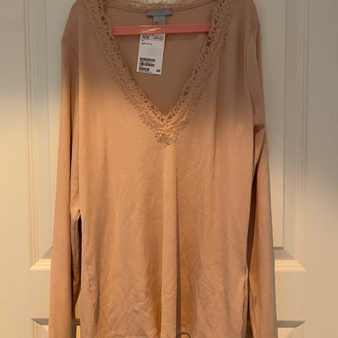Tynn genser med blondekrage og knepping i lys rosa/fersken farge