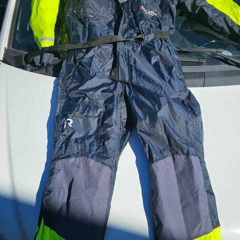 NRS Crux tørrdrakt i størrelse medium. Drakten er i fargen lilla med grå forsterkede partier nederst på bena. Den har bred, elastisk midje og flere lommer på bena. Tørrdrakten er beregnet for padling og annen vannsport der det er behov for vanntett bekledning. Modellen er merket «NRS Crux Drysuit» på lappen.