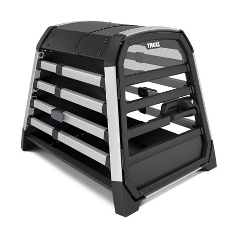 Thule Allax S hundebur i svart utførelse. Buret er konstruert for bruk i bil og gir hunden et avgrenset og sikkert område under transport. Modellen har solid ramme med horisontale ribber i front og sider, samt tette sidepaneler som begrenser trekk. Fronten har dør med låsemekanisme. Buret er utformet med skrå sider for å passe i bagasjerom på de fleste personbiler. Egnet til transport av hund der det er behov for et stabilt og fast montert bur i bilen.