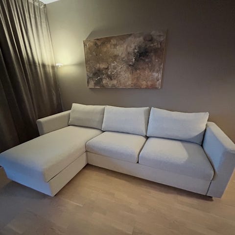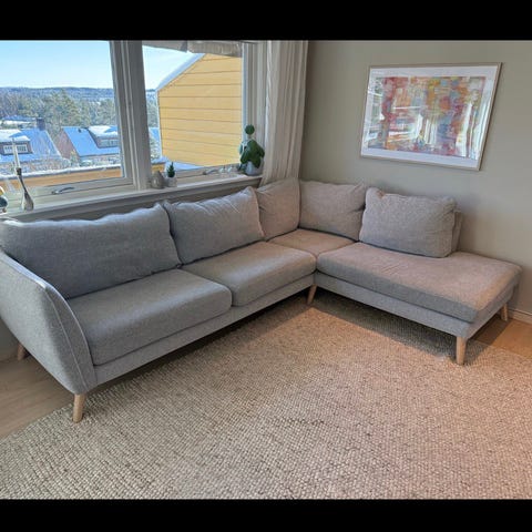 Fin sofa med sjeselong av merket Hjort Knudsen (dansk) kjøpt i 2020 selges.