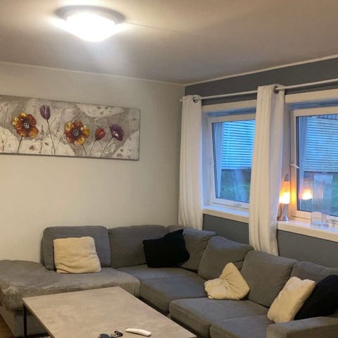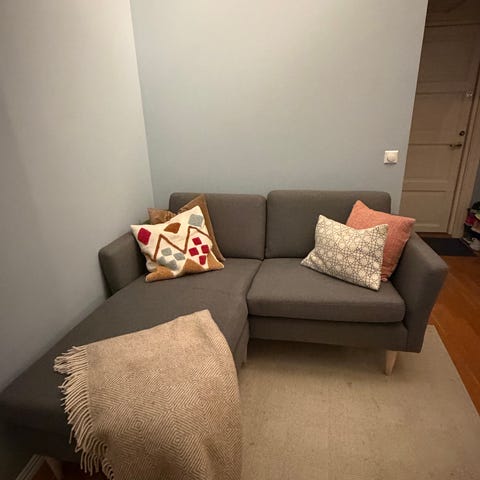 Trekket er lysegrått. Sofaen er komfortabel å sitte i. Den har noen få bruksmerker, men ikke noe som er så veldig synlig. Må hentes på Løren, første etasje. Kan hjelpe til å bære😊Den kan enkelt deles i to moduler.