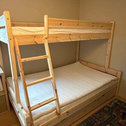 Køyeseng i tre med sort, beiset overflate. Sengen har nedre liggeplass til to og øvre liggeplass, med skråstilt stige festet i front for adkomst til overkøye. Rammen er laget i heltre og passer til standard madrasser i to etasjer. Egner seg for bruk på soverom, gjesterom eller hytte der man ønsker to sengeplasser på begrenset gulvareal. Har stått på hytte og er derfor iķke brukt så mye. Det følger med madrasser, pent brukt. Kan hentes i Mysen. Kan også leveres i rimelig avstand fra Mysen.