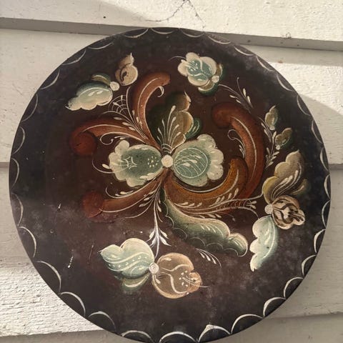 Håndmalt blomstermetallfattallerken med kobberkant fra fine arts studio