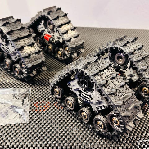 Traxxas TRX-4 All Terrain beltesett til radiostyrt bil. Settet består av fire komplette beltemoduler som erstatter hjulene på bilen. Beltene gir økt framkommelighet på mykt underlag som snø, sand og gjørme. Passer til Traxxas TRX-4 plattformen og monteres på hjulnavene der de originale hjulene normalt sitter. Leveres med ekstra belter i separat pose, slik som vist på bildene.