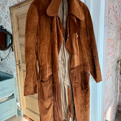 Pen semsket jakke selges.Moren min kjøpte den på 60 tallet. Den er for liten for meg, derfor selger jeg den. Det mangler en knapp, og det trengs noen sting i foret bak. Ellers vil jeg si at den er i fin stand. Jeg finner ikke noen str, men jeg tror det må være str M.