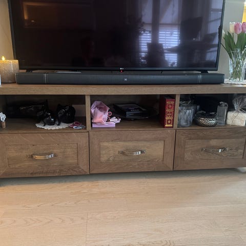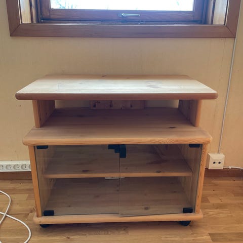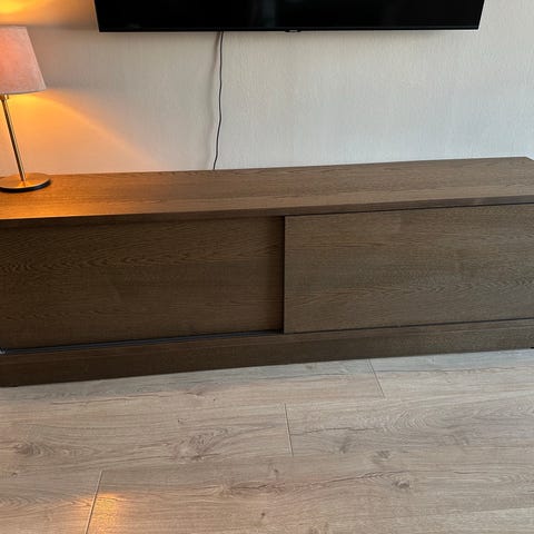 Stor tv-benk gis bort. Mørk eikefiner. Den har to store skap, hver med en hylle. På midten er en åpen hylle med skuff under.