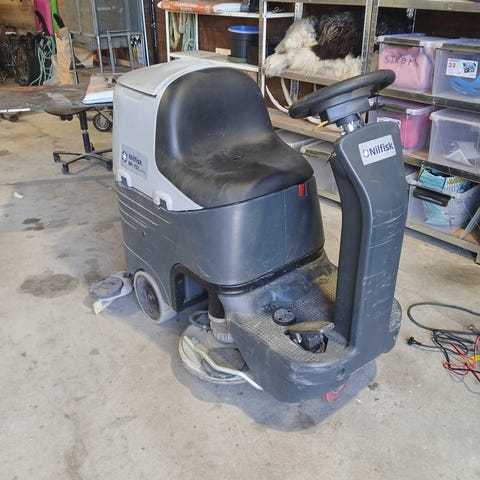 Kärcher gulvvaskemaskin i gul og svart utførelse. Maskinen er en gå-bak modell med håndtak og integrert sugeskrape bak. Den har hjul for enkel forflytning og betjeningspanel på toppen med enkle brytere og knotter. Egnet for rengjøring av harde gulvflater i for eksempel lager, verksted, butikk eller andre næringslokaler. Strømforsyning er 24v (2stk 12v batterier koblet sammen).