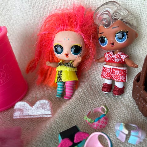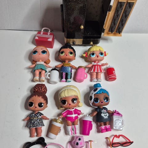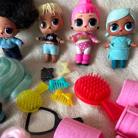 L.O.L. Surprise dukker med tilbehør. Pakken inneholder flere små dukker i ulike antrekk og farger, samt diverse tilbehør som veske, briller, drikkeflaske, hår-ruller, kapsel/oppbevaring og annet tilbehør.