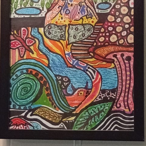 Originalverk som utforsker grensen mellom det menneskelige og det kunstige. Maleriet viser en kvinnelig figur med mekaniske og organiske detaljer en moderne gudinne i møtepunktet mellom natur og maskin.