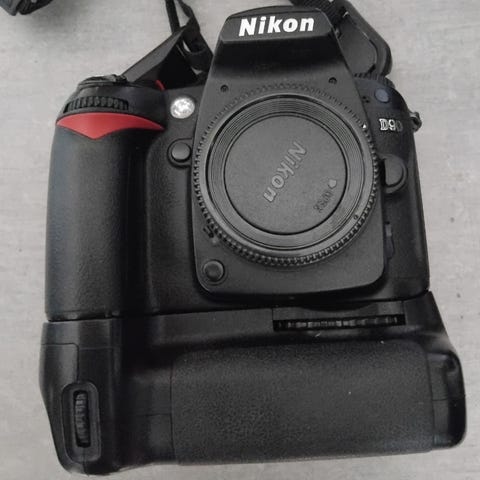 Nikon D90 speilreflekskamera med utskiftbart objektiv. Kamerahuset er i svart utførelse og har innebygd skjerm på baksiden for visning av bilder og menyer. Påmontert zoomobjektiv med manuell og automatisk fokus, samt frontdeksel. Kameraet har standard Nikon-fatning (F-fatning) for kompatible objektiver og tilbehør. Medfølgende kamerastropp og tilkoblingskabel for overføring av bilder til datamaskin eller annet utstyr. Egnet for generell fotografering som portretter, landskap og hverdagsbilder.