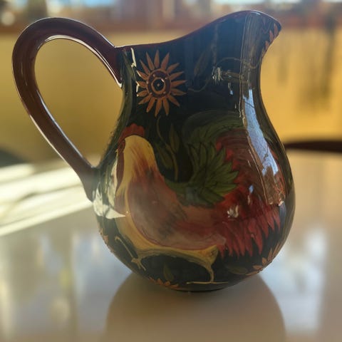 Keramikk mugge og bolle i hvit glasur med dekor. Muggen er formet som en hane med håndmalt blomstermønster i rødt, grønt og gult. Bollen har to hanker, små føtter og blått blomstermønster langs sider og kant. Begge deler kan brukes som serveringsdeler på bordet eller som dekorative elementer i kjøkken eller stue.