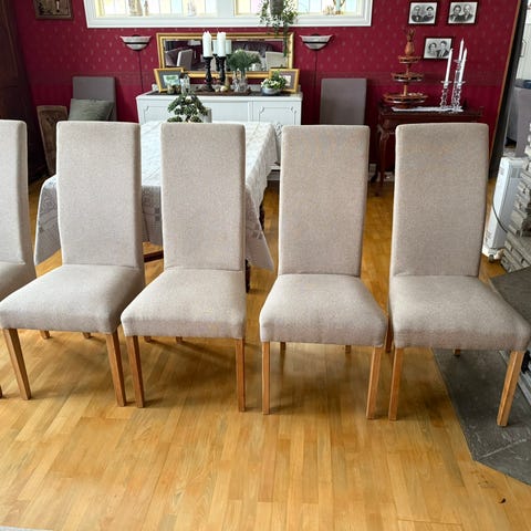 Stolene har noen små hakk/flekker og trenger rens/trekk/maling.